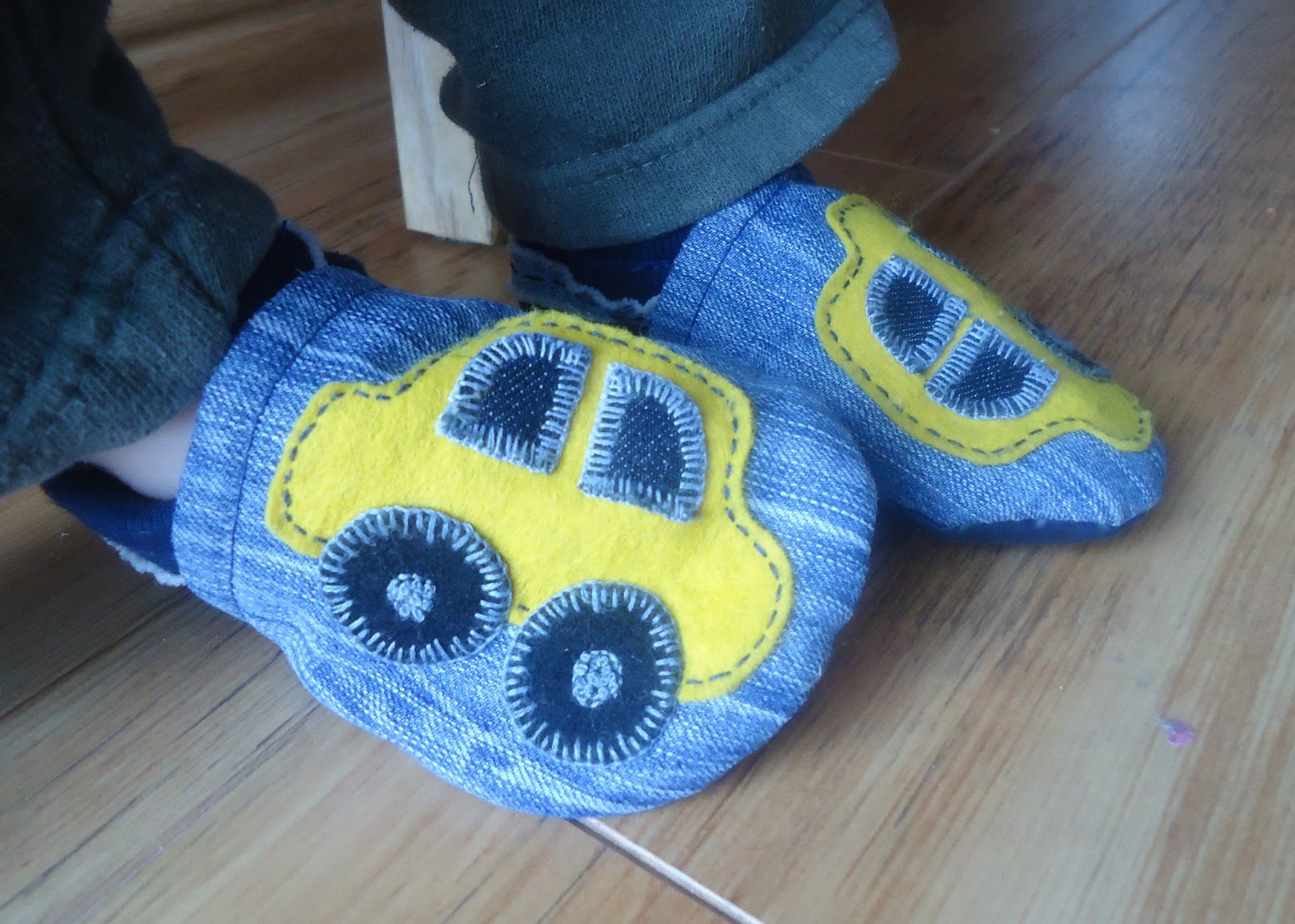Priekiui panaudojau džinsų gabalėlį, šonams trikotažas, o padai iš neperšlampamos lietpalčio medžiagos. Kad galėtų po kambarius tipenti ir nesušlaptų :)